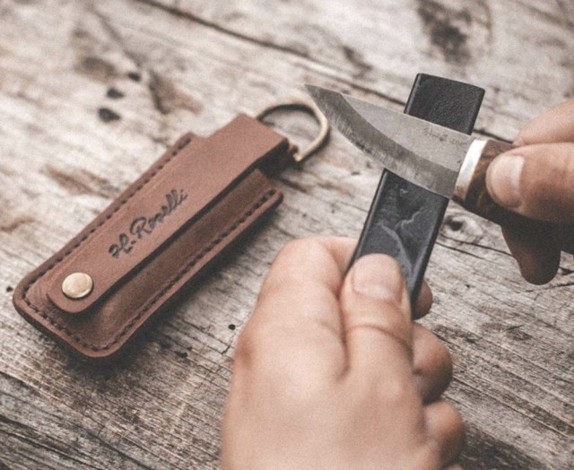 Håndlaget naturlig slipestein i Wästikivi-fyllitt – perfekt for både grov- og finsliping av Roselli-kniver.